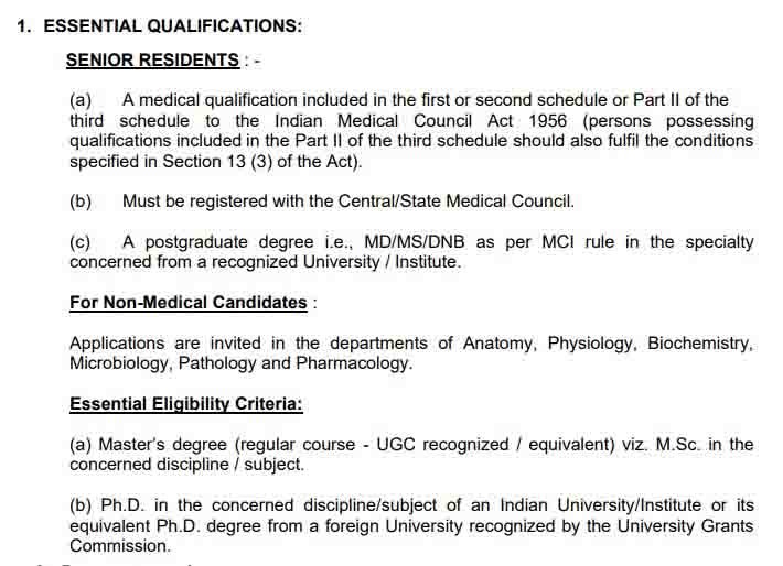 All India Institute of Medical Sciences (AIIMS) दोस्तों आप लोगों के लिए मैं नीचे एक स्क्रीनशॉट लगाया है यह ऑफिशियल वेबसाइट से और नोटिफिकेशन से लिया गया है, और आप लोगों को इसमें क्वालिफिकेशन की फुल जानकारी मिलेगी की कितनी क्वालिफिकेशन आप लोगों की होनी चाहिए तभी आप लोग इस फॉर्म को अप्लाई कर पाएंगे और अप्लाई करने से पहले आप लोग जरुर चेक कर लें कि आप लोगों की क्वालिफिकेशन इस क्वालिफिकेशन से मैच हो रही है, अगर मैच हो रही है तभी आप लोग इस वैकेंसी की ऑनलाइन कर पाएंगे ऑफिशल वेबसाइट का और फुल नोटिफिकेशन का लिंक मैंने ऊपर दे दिया है, वहां से आप लोग ऑनलाइन कर सकते हैं।